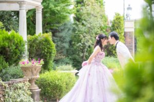 チャペルでの撮影を終えたあとは、併設されたガーデンでの撮影もお楽しみいただけます。緑に囲まれた空間や季節の花々が咲く風景の中で、自然光を活かしたやわらかな雰囲気の写真を残すことができます。