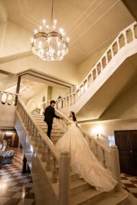 お城といえば、やはり石造りの階段は外せません。ドレスの裾を長く引いて階段に立つだけで、まるで映画のワンシーンのような写真が撮れます。新郎が手を差し伸べてエスコートする場面は、優雅でドラマチックな印象に。高低差を活かすことで、自然と構図に立体感が生まれ、衣装のシルエットも引き立ちます。