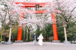 群馬県太田市のランドマークとも言える冠稲荷神社の「大鳥居」。春になると、この大鳥居を包み込むようにソメイヨシノが咲き誇り、多くの人々を魅了します。この壮大なスケールの中でおふたりの門出を記録することは、まさに一生モノの体験となるでしょう。