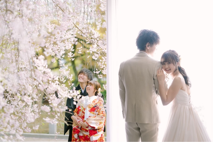 四季の彩りや歴史ある風景に映える和装ロケーション撮影と、光に包まれた洋装スタジオ撮影。ふたつの世界観を一日で楽しめる、人気の贅沢プランです。 和装ならではの所作の美しさや日本の情緒、洋装だからこそ叶う洗練された雰囲気―― 衣装によって生まれる新しい表情が、おふたりの魅力をより豊かに映し出します。